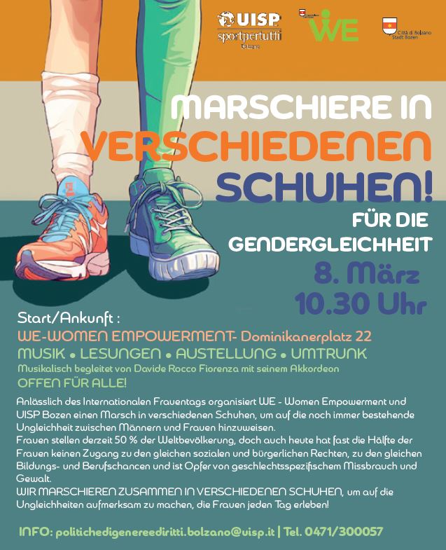 Anlässlich des Internationalen Frauentags organisiert WE-Women Empowerment und UISP Bozen einen Marsch in verschiedenen Schuhen, um auf die noch immer bestehende Ungleichheit zwischen Männern und Frauen hinzuweisen.Frauen stellen derzeit 50 % der Weltbevölkerung, doch auch heute hat fast die Hälfte der Frauen keinen Zugang zu den gleichen sozialen und bürgerlichen Rechten, zu den gleichen Bildungs- und Berufschancen und ist Opfer von geschlechtsspezifischem Missbrauch und Gewalt.