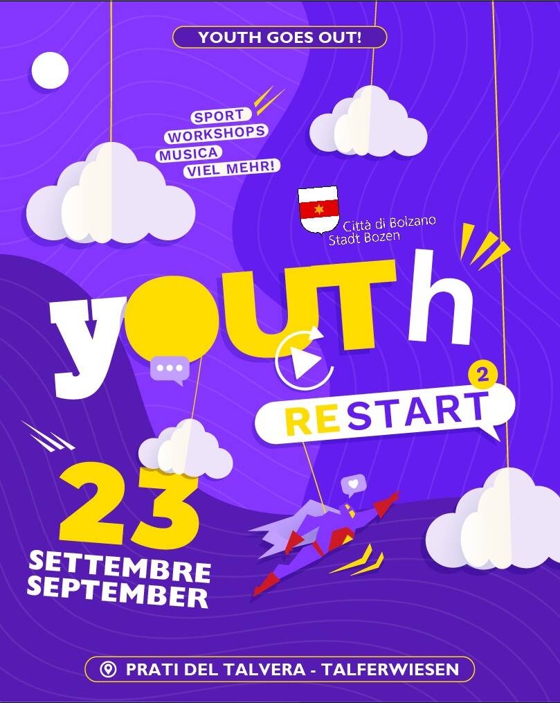 "Youth Restart" ist eine Initiative des Assessorates für Jugend der Stadtgemeinde Bozen, die 2022 gegründet worden ist mit dem Ziel, die verschiedenen Jugendkulturen in den Mittelpunkt zur rücken und ein Event für Jugendliche anzubieten. In diesem Zusammenhang sollen auch die Vereine und Organisationen, die im Bereich der Jugendarbeit tätig sind, mehr Sichtbarkeit erhalten. Die heurige „Youth Restart“-Ausgabe findet am 23. September 2023 neben dem Skatepark PLAZA auf den Bozner Talferwiesen statt. Es wirken 23 Jugendvereine und –organisationen mit.