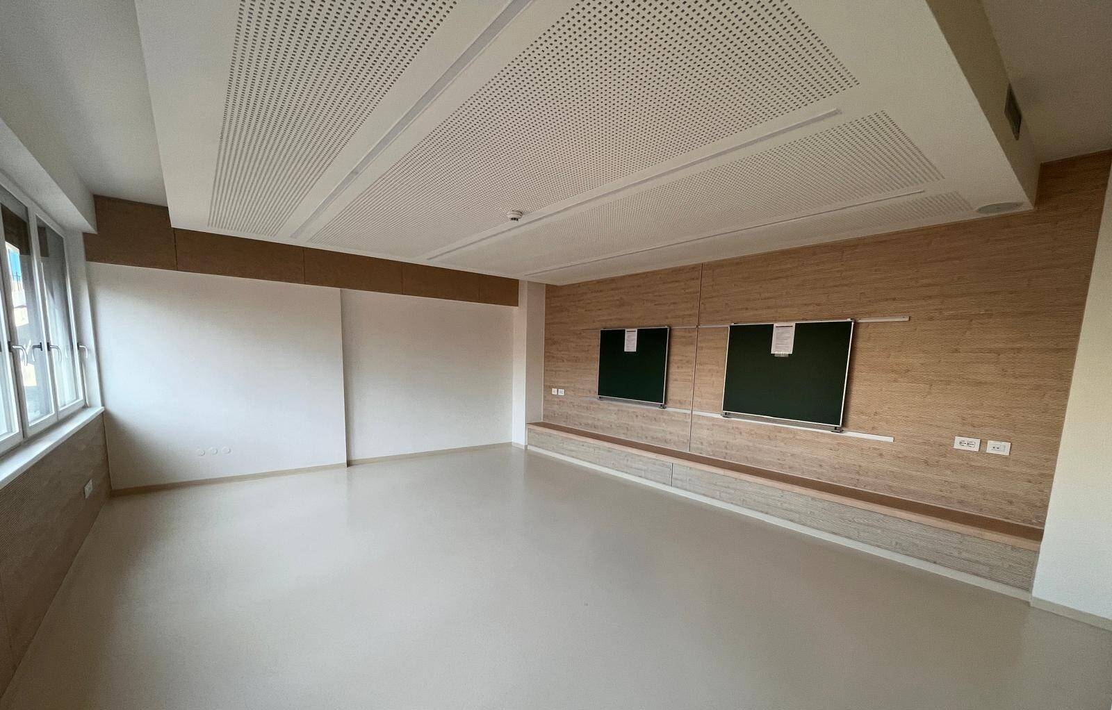 Im neuen Gebäudeflügel befinden sich 9 Klassenzimmer und 2 Gruppenräume, 5 Laborräume, Büroräume im Erdgeschoss und eine neue Aula Magna mit 224 Sitzplätzen, die als Mehrzwecksaal konzipiert ist. Die Aula Magna hat einen getrennten Eingang vom Innenhof aus. Sie verfügt über ein Foyer und sie kann auch für außerschulische Veranstaltungen genutzt werden. Im Untergeschoss sind die Technikräume, das Archiv und Lagerräume untergebracht. Es wurde auch eine neue Mittelspannungskabine installiert, die direkt von der Straße aus erreichbar ist. Auf dem Dach wurden Belüftungsgeräte installiert, die eingehaust worden sind, und die restliche Dachfläche ist begrünt worden. Das Schulgebäude wurde auch an das Fernwärmenetz angeschlossen und erfüllt alle Vorgaben für ein KlimaHaus A.
