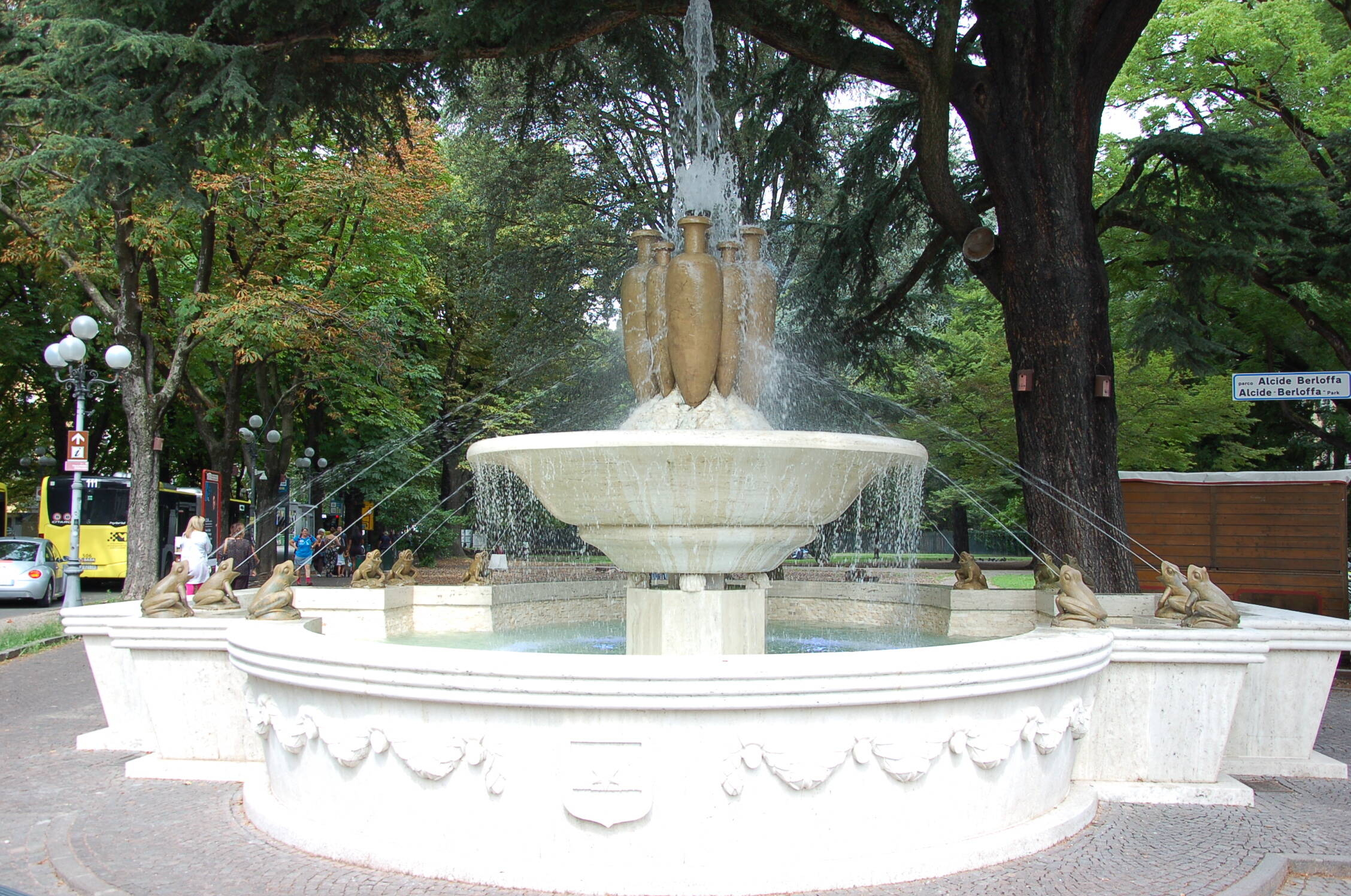 jeweils als Relief gearbeitet und zeigen das Bozner Stadtwappen. Das Brunnenbecken ist mit einem Travertinmosaik verkleidet. In der Mitte der großen Brunnenschale, die einen Durchmesser von 4 Metern hat, sind mehrere Amphoren aus Bronze angebracht. Am Beckenrand befinden sich zwölf wasserspeiende Frösche aus Bronze, die in Dreiergruppen angeordnet und in Richtung der Amphoren ausgerichtet sind. Oberhalb der Amphoren befindet sich die zentrale Wasserdüse. Im Zuge der Sanierungsarbeiten wurden die Frösche und Amphoren aus Bronze wie auch die Brunnenaußenwände und die Brunnenschale restauriert. Dabei wurden Kalk, Rostablagerungen und Unreinheiten entfernt und die beschädigten Bereiche sowie die Fugen neu verputzt. Die Innenverkleidung wurde ausgetauscht und das Becken neu abgedichtet. Außerdem wurden neue Led-Leuchten in den Boden eingelassen. Auch das Wassersystem wurde runderneuert. Die Stahlrohre wurden ausgetauscht und ein neues Filtersystem eingebaut, das die Wartung des Brunnens künftig erleichtern soll. Gemeinsam mit dem Landesdenkmalamt wurde ein System entwickelt, das die Brunnenschale im Winter besser vor Witterungseinflüssen schützen soll. Die Bauleitung oblag dem städtischen Infrastrukturamt. Für die Sicherheitskoordinierung war Ing. Mirko Zöschg zuständig. Die Arbeiten wurden von der Bozner Firma Merotto Bau ausgeführt. Die Kosten der Restaurierungsarbeiten, die rund 3 Monate dauerten, beliefen sich auf 154.000 Euro.
